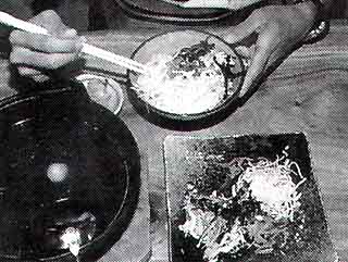 | @これが「鶏飯」。ご飯と具と鶏スープが別々に出てくるのだ | Aまずご飯をよそう。次に具を乗せてスープをかけるので、ご飯はやや少な目がいい。 |