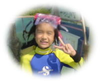 10/13日はこんどは私が体験ダイビングをしました。すっごく重いタンクをセットしてもらって、耳ぬきをして6〜7mぐらいもぐりました。さいしょはきちんと耳ぬきができなかったけどだんだんうまくできるようになりました。はじめはふく田さんがぴったりついていてくれたけれど、そのうち自分1人でさっさと泳いでいたとふくださんはいっていました。ふくださんのさんそがきれてあわててもどったくらいでした。スキンダイビングよりももっと魚がたくさんいました。